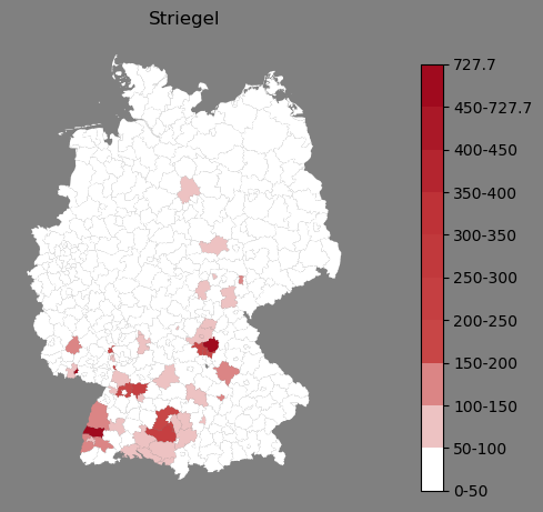 Relative Verteilung des Namens Striegel (1996)Direkt zur Karte Die Farbskala zeigt die Anzahl von "Striegel" bezogen auf je 1 Million Einträge. |